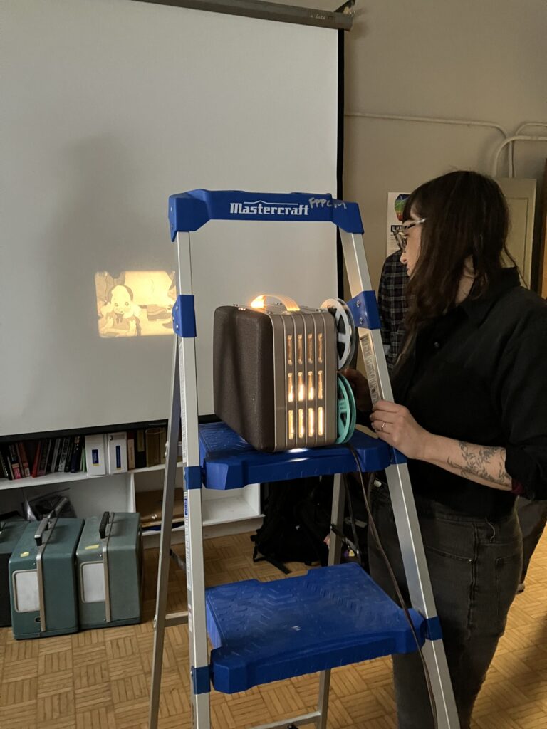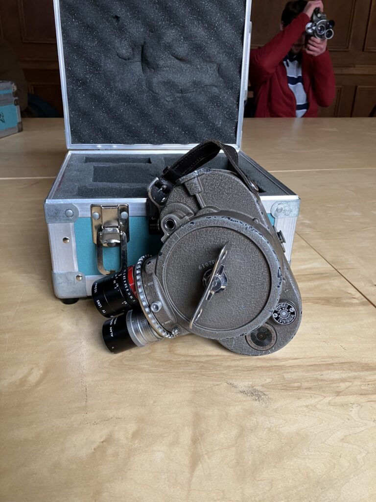 実践演習では、16mmフィルムの撮影機で撮影をしたり、8mmの映写をしたりしました。撮影に使用したのはアメリカの映画機材メーカー、ベル&ハウエルのキャメラで、フィルムのキャメラで映像を撮るのは初めてだったので、そのずっしりとした重さが新鮮でした。映写ではコダックのブランド、ブローニーの映写機を使用しました。