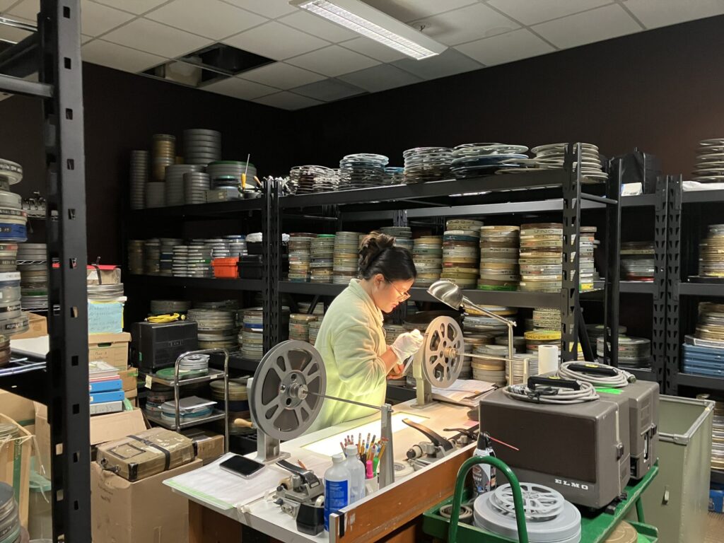 Betty Furgusonコレクションは、約300巻の16mmと8mmフィルムを中心としていて、3チームに分かれて確認をしました。缶にタイトル記載がない場合はフィルムを少しほどいてリーダーやコマを確認しましたが、状態が悪いとパラパラ欠けてしまうフィルムもあったり。11の箱の中に入ったフィルム缶や剥き出しのフィルムたちはそのほとんどが咳き込むくらいに埃に覆われていて、フィルムを守るためだけではなく、自分たちの健康のためにも手袋やマスク(もしあればゴーグル)が必要という具合で、色んな意味でリスクを伴う作業だなと身に沁みました。また、同じ作品の異なるリールが別々の箱に入っている場合などもありますが、ただ単に自分が確認したフィルムの情報を羅列していくだけだとそういう情報が見落とされてしまうので、しっかり情報を共有しながら作業を進めることが大切だなと感じました。